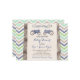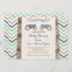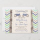 convites para chuvas de bebês com chevrons em verde, azul, aqua e taupe e duas ilustrações de trator azul, para dar boas-vindas aos gêmeos
