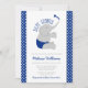 Um convite moderno do chá de fraldas do elefante dos azuis marinhos e das cinzas. O teste padrão de bolinhas azul e branco doce limita as bordas. Um elefante bonito do bebê que veste uma fralda dos azuis marinhos com corações minúsculos. Aperfeiçoe para um partido de chá de fraldas do menino.