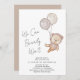 Convite de chá de fraldas neutro em relação ao gênero, com uma ilustração de uma aquarela fofa de um ursinho de pelúcia flutuando com balões e "Nós podemos esperar muito" em um roteiro de caligrafia manuscrito.