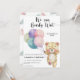 "Não podemos esperar". Celebrar com esta festa de chá de fraldas do ursinho de pelúcia! Urso de pelúcia bonitinho de aquarela com balões coloridos. Fundo com céu azul-rosa-aquarela.