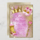 Chá de fraldas da princesa real com coisas bonitinhas cor-de-rosa e princesas douradas num lindo fundo cor-de-rosa e ouro. Este convite à chá de fraldas da princesa real é facilmente personalizado com os detalhes do seu evento.