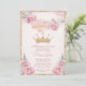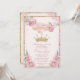 Este convite de chá de fraldas personalizado apresenta um tema da princesa de conto de fadas para uma menina em um fundo cor-de-rosa macio. Uma imagem de uma pequena princesa reluzente dourada tiara é ilustrada abaixo de um cartaz caprichoso que diz, "é uma menina". Um quadro reluzente dourado borda o convite, com rosas cor-de-rosa e buquês respiratórios para bebês impressos nos cantos superior esquerdo e inferior direito.