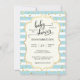 Cartões de convite de chá de fraldas giros e giros em letras negras. O padrão listrado branco e azul-claro e pastel sobre um fundo brilhante dá esse aspecto moderno. Faux gold confetti para o efeito "chá". Perfeito para o chá de fraldas do bebê. Obter adesivos correspondentes!