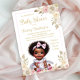 Celebre a chegada com nosso charmoso convite para chás de fraldas, com uma adorável menina afro-americana. Ela tem uma expressão doce e encantadora, vestida com um bonito vestido rosa e branco com um arco de cabelo e calçados em um fundo floral de cor d'água bonito. Perfeitamente concebido para captar a essência de uma ocasião alegre, este convite é ideal para qualquer chá de fraldas feminino. Personalize com facilidade e torne seu dia especial ainda mais memorável. Compre agora e convide seus entes queridos em estilo!