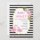 Polígono de folha de ouro, flamingos cor-de-rosa, flores tropicais e listras, convite para chá de menina. Apresenta flamingos cor-de-rosa, flores tropicais e folhas. O texto está em um quadro branco com moldura de polígono de folha de ouro. Por trás dele há um padrão listrado com listras pretas e brancas.