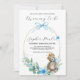 Urso bebê bonito com coroa ouro e arco azul numa estrutura dourada e flores azuis