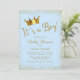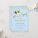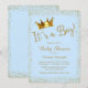Chá de fraldas azul-bebê e dourado convite com bonito escrita brilhante dourada e coroa dourada príncipe em um belo fundo azul-bebê e dourado brilhante. Este elegante convite a chás de fraldas azul e dourado é facilmente personalizado para o seu evento simplesmente adicionando os seus detalhes no estilo de letra, cor e texto da sua escolha. Você também pode alterar a cor de fundo. Este é um design impresso sem brilho real.
