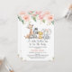 Convite para chás de fraldas florais, cor-de-rosa, bonito e delicado, com algumas rosas cor-de-rosa, arranjos florais com uma sugestão de folhagem verde e dourada e quatro animais de safari de cor-de-água bonitinhos.