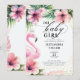 Uma doce ilustração aquosa de um flamingo cor-de-rosa, com uma tiara na cabeça e rodeada por folhas tropicais exuberantes em cor-de-rosa arranjadas em uma armação, com um confete dourado (isto é um efeito digital, não uma folha real) é a peça central deste adorável convite para chás de fraldas de menina que é perfeito para os meses de verão para uma mãe ser que ama o tema do chá de fraldas flamingo. Afirmação, ousadas flores de hibisco acrescentam ao tema tropical e à caligrafia moderna a elegância e a vibe feminina. Moderno e moderno.