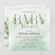 Elegante chá de fraldas botânico verde apresentando um fundo poeirento de lavagem de cor verde-d'água, uma bela folhagem verde envolta em letras que soletram a palavra "BABY", sotaques de brilho dourado e um modelo de celebração de chá de fraldas que é fácil de personalizar.