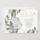 BABY! Um doce amendoim está a caminho! Imprima seus hóspedes com este belo convite de chá de fraldas neutro de gênero com ilustração aquática de um adorável elefante bebê cercado por verde-luxuoso em verde e ouro. Use os campos modelo para adicionar seus detalhes. Se quiser alterar o estilo da fonte, a cor ou o posicionamento do texto, basta clicar no botão "Personalizar Mais".