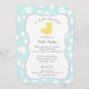 Bolhas e convite para o chá de fraldas do tema Ducky com pontos divertidos e tons neutros de azul-bebê, roxo suave, amarelo e cinza.