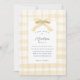 Um convite de chá de fraldas numa xadrez de aquarela doce em amarelo pálido com um arco/fita amarrada. O verso do convite repete a xadrez de aquarela. Personalize facilmente o seu convite. Para obter informações sobre alterações de design personalizadas pelo designer independente, envie um email para paula@labellarue.com ANTES de personalizar ou fazer um pedido. Arte original criada por Paula Pecevich, La Bella Rue