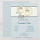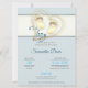 Um convite para chá elegante e fofo para o bebê. Apresentando formas cardíacas de cor de ouro ao redor de pegadas de bebês com coração e um claro fundo azul com pequeno padrão de cor de ouro. Personalize alterando o texto com seus próprios detalhes ou clique em personalizar para adicionar seu próprio toque.