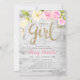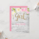 Convite para o chá de fraldas elegante com flores cor-de-água, cor-de-rosa e creme (magnólia e camellia), com pontos falsos de brilho dourado. O texto diz "é uma menina" na letra do script dourado. O fundo é textura branca de madeira. Personalize este convite para modelo do tema do país rústico adicionando suas próprias informações.
