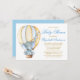 Convite para Chá de fraldas de Elefante de Balão de Ar Quente Azul de Aquecimento com Aquecimento de Aquarela Texto Dourado e Azul.