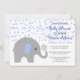 Contra um bonito fundo de confete azul, um elefante de cinza com orelhas polares azuis e brancas traz uma flor ao seu chá de fraldas! Seu texto personalizado à direita está em cinzas e azul correspondentes, e há bastante espaço para mudanças em oito campos de texto. A imagem e o texto são colocados sobre um fundo branco. A parte de trás da placa também é branca, com o mesmo fundo confetti. Bonito, especialmente para um chá de bebê.