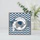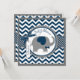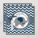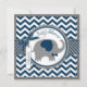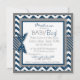 Elefante azul com pássaro empoleirado no ombro e marinho e impressão de fêmur branco e arco de aparência 3D e fita para um cartão de convite para chá de fraldas de menino. As cores são azuis e cinza.