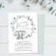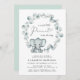 Um convite para chás de fraldas bonitinho, neutro em termos de gênero, que apresenta "A Sweet Little Peanut Is On Your Way" na tipografia moderna e um guião de na moda com um inchaço cardíaco, e uma ilustração com aquarelas de um elefante bebê verde em forma de horta pastel, numa coroa de verde-sábio eucalipto verde-verde.