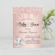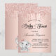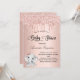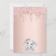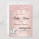 Para um chá de fraldas, comemorando uma menina. Um fundo de aparência metálica falsa rosa dourado. Decorado com rosa dourado, brilho rosado, pintura gotejante, e uma linda menina elefante. Personalize e adicione o nome da futura mãe e os detalhes da festa. O nome e o texto: Chá de fraldas são escritos com um script de estilo manuscrito