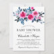 Design de convite para chás de fraldas elegantes e femininos, com rosas cor-de-água cor rosa, folhagem azul e cinza em fundo branco. O lado inverso do convite é cor-de-rosa brilhante.