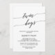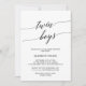 Esta elegante carta de convite para chás de fraldas de rapazes gêmeos para caligrafia negra é perfeita para um simples chá de fraldas. A design neutra apresenta uma carta minimalista decorada com tipografia romântica e caprichosa.