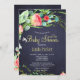 Modelo de convite para chá de fraldas russo na meia-noite escura na moda de quadro azul de marinho apresentando grandes rosas vermelhas cor-de-rosa e coral com azul lacrimogêneo e folhas verde-sábio e com roteiro branco e ouro. Preencha suas informações nos pontos, Você pode optar por personalizá-las mudando ainda mais as fontes e as cores das letras. — O convite é adequado para primavera de verão ou outono cair no jardim ou festas de chás de fraldas rústicos do quintal/garoto ou garota ou revelação de gênero. — Se precisar de assistência, por favor, entre em contato comigo!