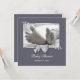 Um convite de chá de fraldas de gênero elegante e neutro com uma fotografia a preto e branco de recém-nascidos que ainda vestem as bandas hospitalares enquadradas contra um fundo de cinza lavanda e embelezadas com folhas de filigrana clássicas e uma fita prateada presa a um arco. Personalize este conjunto de chás de fraldas adicionando o nome da nova mãe.