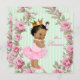 Um convite de chá de fraldas rosa e verde com uma adorável princesa étnica americana africana vestindo um tutu e uma corda de pérolas em uma rosa bonito e um fundo verde de menta. Você pode personalizar este elegante convite de chá de fraldas rosa e verde com os detalhes do evento no estilo de fonte, cor de fonte e texto de sua escolha.