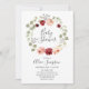 Nosso convite de chá de fraldas boêmico apresenta uma coroa de água floral com flores borrifadas e embaçadas com verde.