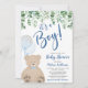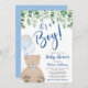 Este convite de chá de fraldas do ursinho de pelúcia apresenta aquarela Eucalyptus verde, balões azuis, fonte moderna de escrita de caligrafia e ilustração do ursinho de pelúcia castanho.