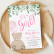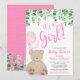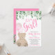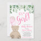Este convite de chá de fraldas para ursinho de pelúcia apresenta aquarela Eucalyptus verde, balões cor-de-rosa, moderna letra do roteiro de caligrafia e ilustração do ursinho de pelúcia castanho.