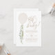 Convide amigos e familiares a compartilharem a alegria da chegada do seu pequeno com este convite para chá de fraldas, com balões de aquarela e eucalipto com tipografia de ouro.