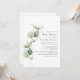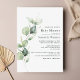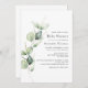 Personalize nosso modelo de convite para chá de fraldas de de folhagem do eucalipto moderno para seu partido com seus amigos para chá do bebê. Apresentando um design minimalista com folhagem de cor verde-d'água. Perfeito para outros eventos especiais como salvar as datas, anúncios de nascimento e muito mais.