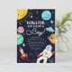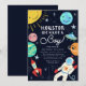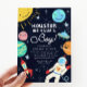 Cartão modelo de convite para chá de fraldas de tema espacial bonito, com ilustração de uma galáxia no cretão, incluindo um astronauta, U.F.O., planetas, estrelas, foguete. O texto da tipografia diz "Houston nós temos um menino!"