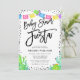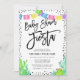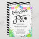Este convite mexicano para chá de fraldas de fiesta apresenta cacto de aquarela, papel picado e uma fonte moderna de caligrafia. Colorida e divertida para uma festa de chá de fraldas temático do deserto. As riscas pretas e a borda confetti fazem disso uma escolha única para o seu evento.