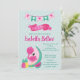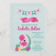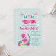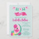 Um convite de chá de fraldas com um fundo de bolinhas. Uma bela ilustração flamingo com melancias e abacaxi. Uma faixa de bunting com pequenos corações ao longo do topo. Esquema de cor rosa e verde. Fita rosa quente na parte superior diz "OH baby"!