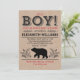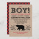 Celebre em estilo com este convite para chá de fraldas lumberjack. Apresenta uma inscrição ousada, um urso entre a folhagem, com um padrão de xadrez de búfalos nas costas. Faz um tema adorável para o seu chá. Projetado para você pelo Blackberry Boulevard.