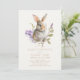 Este convite de chá de fraldas de menina bonito apresenta um coelho/coelho com flores lilás roxas em aquarela. O verso apresenta um fundo verde-claro de chá com padrões florais lilases púrpuros. Personalize-o para as suas necessidades. Você pode encontrar mais coelhinhos na minha loja.