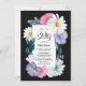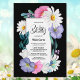 Um vibrante convite floral, bordado a preto, com flores cor-de-rosa e roxas, margaridas brancas e verde à volta do texto.