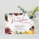 Convite para chá de fraldas de outono com tema floral. A design apresenta flores e abóboras de cor d'água burgundy com texto de script.