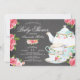 Convite de festas de chá de chá de fraldas d'água apresentando um belo pote de chá vintage e xícaras com flores cor-de-rosa, colocados sobre um fundo de quadro comum popular.