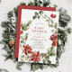 Este elegante convite para chás de fraldas inclui poinsetos vermelhos, papoilas, colheres, bagas, pinheiros e verde em aquarela. O verso apresenta fundo burguês com padrões brancos de neve. Personalize-o para as suas necessidades. Você pode encontrar produtos correspondentes na minha loja.