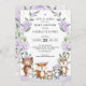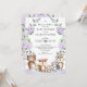 Este convite para chás de fraldas super-bonito de matas apresenta adoráveis animais florestais e terras verdes florais púrpuras e suaves. Use as ferramentas de design para editar o texto, alterar a cor e o estilo da fonte para criar um design de convite exclusivo.