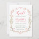 Este convite de chá de fraldas para meninas apresenta um quadro floral cor-de-rosa e verde, enfeitado com borboletas e fitas.