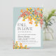 Um convite perfeito para um chá de fraldas para um evento de outono. A design apresenta um grande conjunto de lindas flores coloridas de queda e é acentuada por uma caixa branca de vassoura e um fundo leve empoeirado.