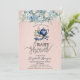 O convite para chás de fraldas bonitos apresenta bule azul-aquarela, mirtilo e flores em fundo cor-de-rosa. Esses convites para chuveiros de bebês são facilmente personalizados para seu evento simplesmente adicionando seus detalhes.