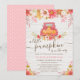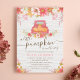 Uma garota fofa, chá de fraldas de convite para modelo de outono, com um caminhão cor-de-rosa, abóboras laranja, folhas de outono e flores margaridas. Perfeito para um chá de fraldas temático "Pequena abóbora está a caminho". Personalize facilmente este convite usando as ferramentas online de modelo.