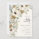 Chá de fraldas Floral Moderno Elegante. Este elegante convite de chá de fraldas de inverno apresenta lindas cores aquáticas pintadas manualmente folhas e bagas azuis empoeiradas, flores de anêmona creme, verde-salva e pinecones organizados como uma moldura de na moda num marfim | fundo creme. Encontre itens correspondentes na Coleção Floral de Azul de Inverno.