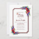 Uma borda burgundy com burgundy com convite para chás de fraldas florais vermelho, burro, azul e roxo, com texto azul sobre fundo branco.